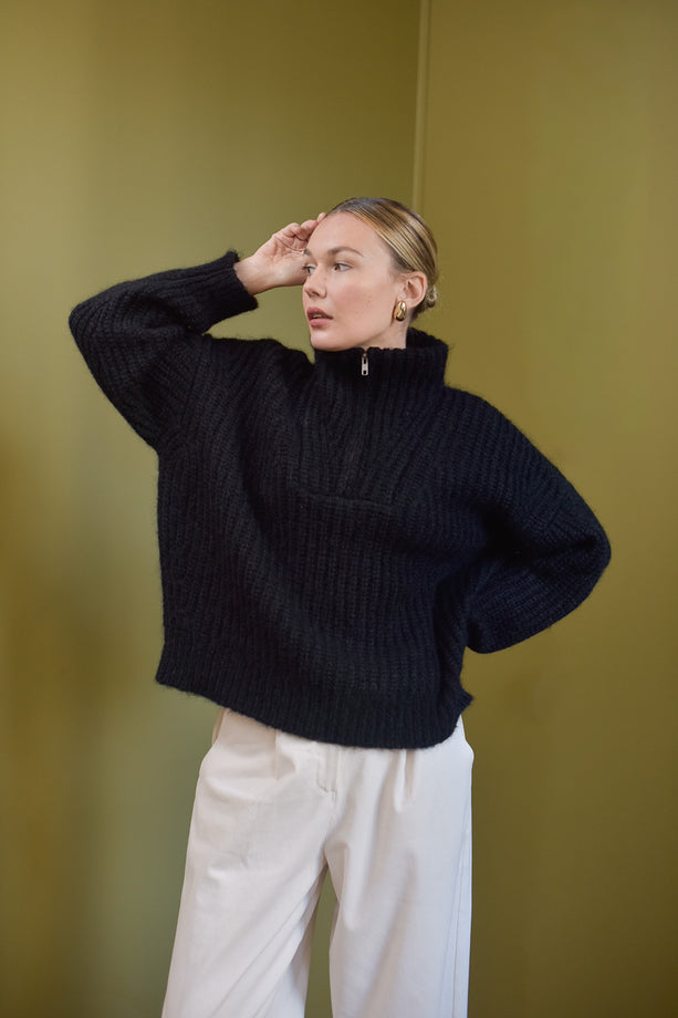 On craque pour Sacha, le pull d’hiver bien chaud qui réinterprète le camionneur classique avec une touche résolument féminine. Sa maille côtelée perlée noire lui confère du caractère, son col zippé se porte ouvert pour un style décontracté ou fermé pour plus de protection. Sa coupe légèrement loose et courte tombe élégamment sur les hanches, créant une silhouette allongée naturellement.