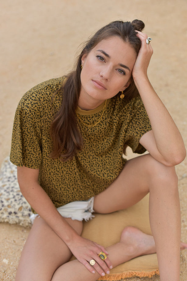 With its ever- trendy print, the leopard tee revisited by Marlot Paris plays the card of subtle detail. With its natural hues, its mini pattern and its soft material, it becomes a strong piece easy to combine with raw jeans or a denim jacket . A summer essential for those who like a wild touch with cool and controlled.